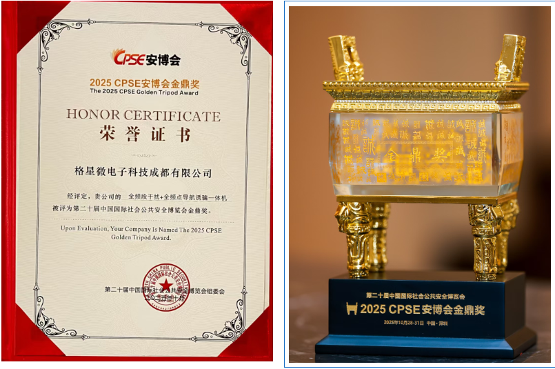 格星微凭借核心产品 “全频段干扰 + 全频点导航诱骗一体机”,成功斩获 “金鼎奖” 殊荣。这一奖项不仅是行业对格星微技术实力的高度认可,更是对其在数字安防领域创新突破的褒奖。